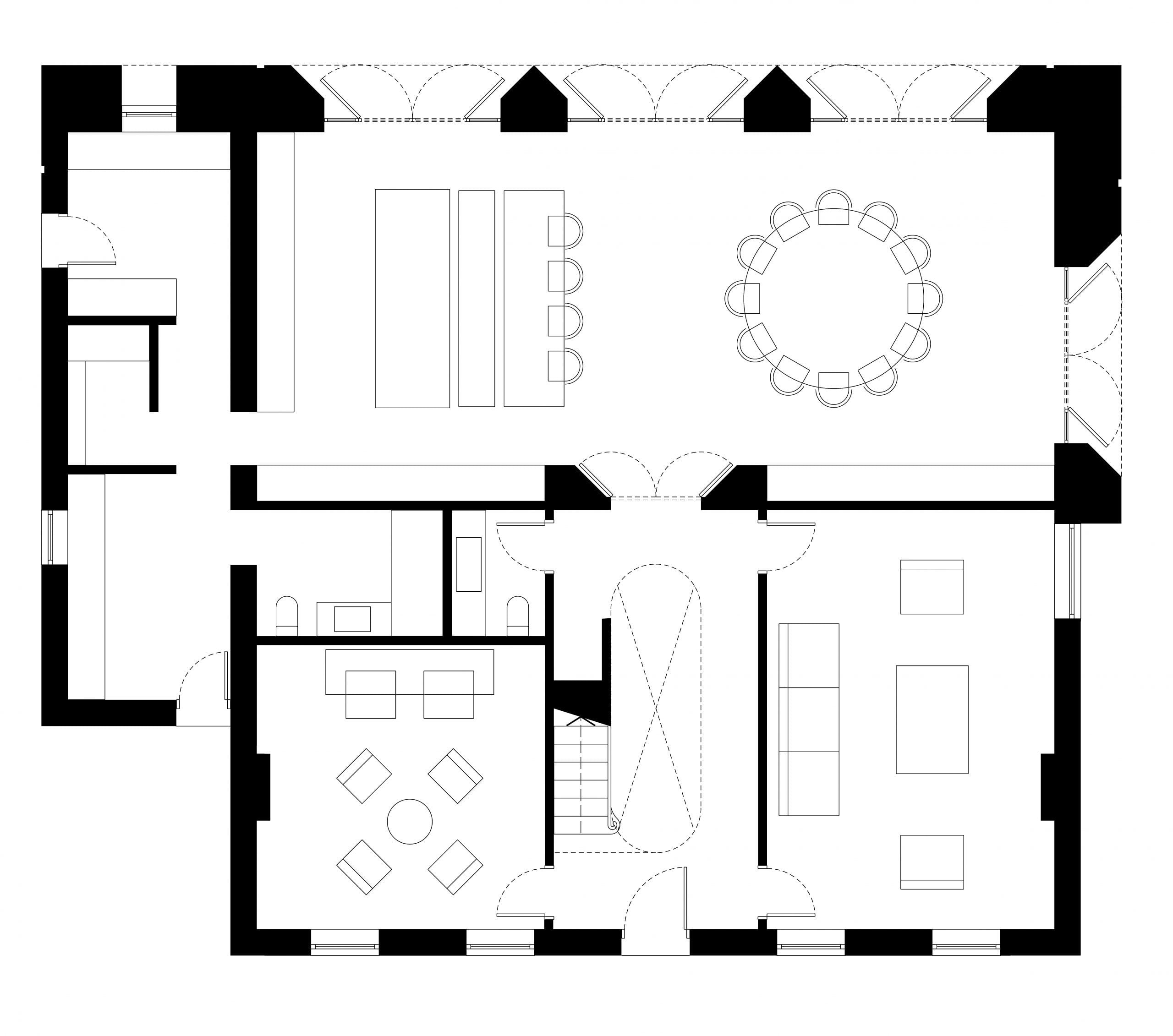 Additionally, the rear elevation opens the ground-floor living spaces to a terrace and reflection pool through three large arched openings. These openings feature compound curve reveals clad in small-format ceramic tiling, which offers a counterpoint to the formal Portland stone and buff brick used elsewhere.
